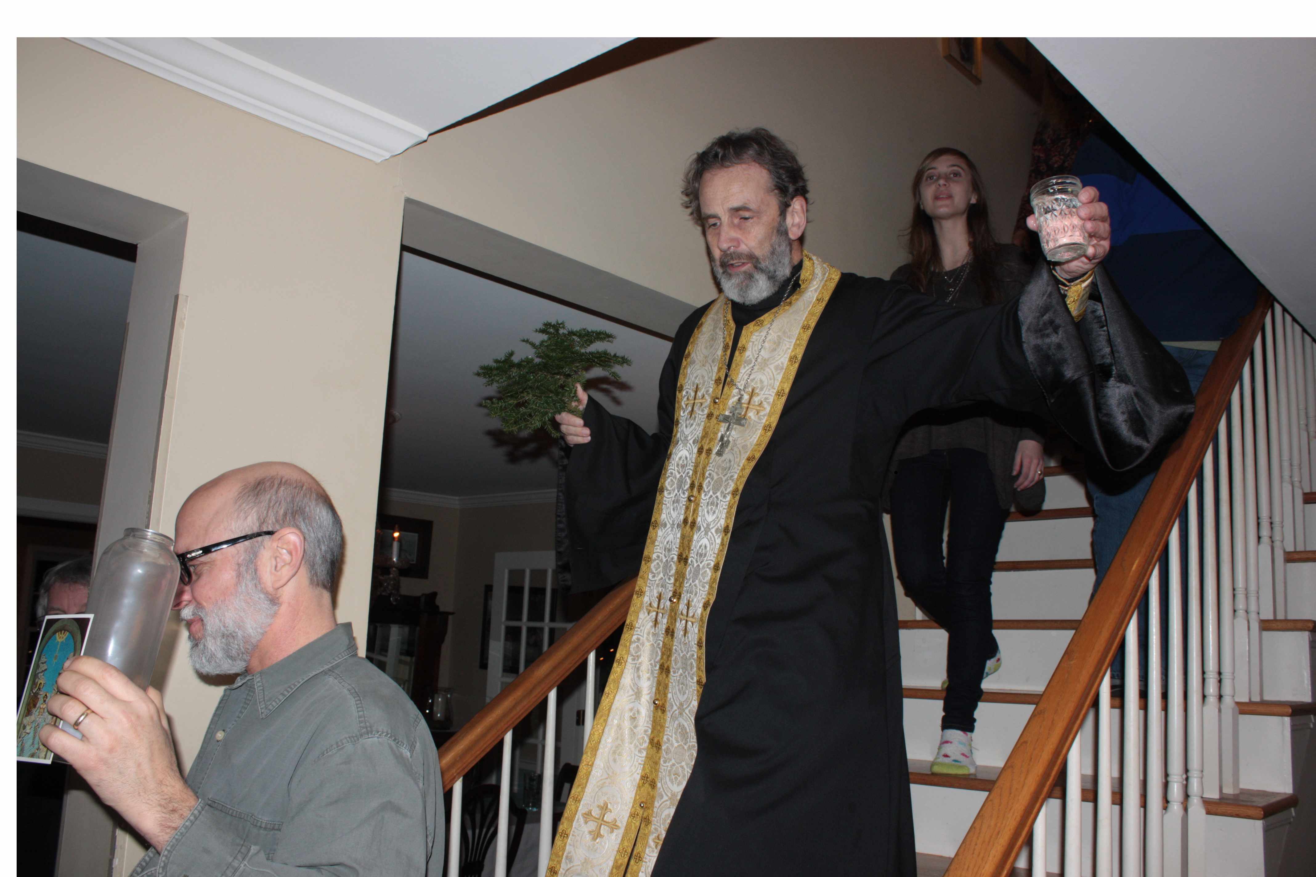 Our Father Paul recently came out and blessed our home. He went through the entire house with the cross and with holy water, blessing each room and claiming it as Christ’s own dwelling place. All were smiling as we were occasionally splashed with holy water.