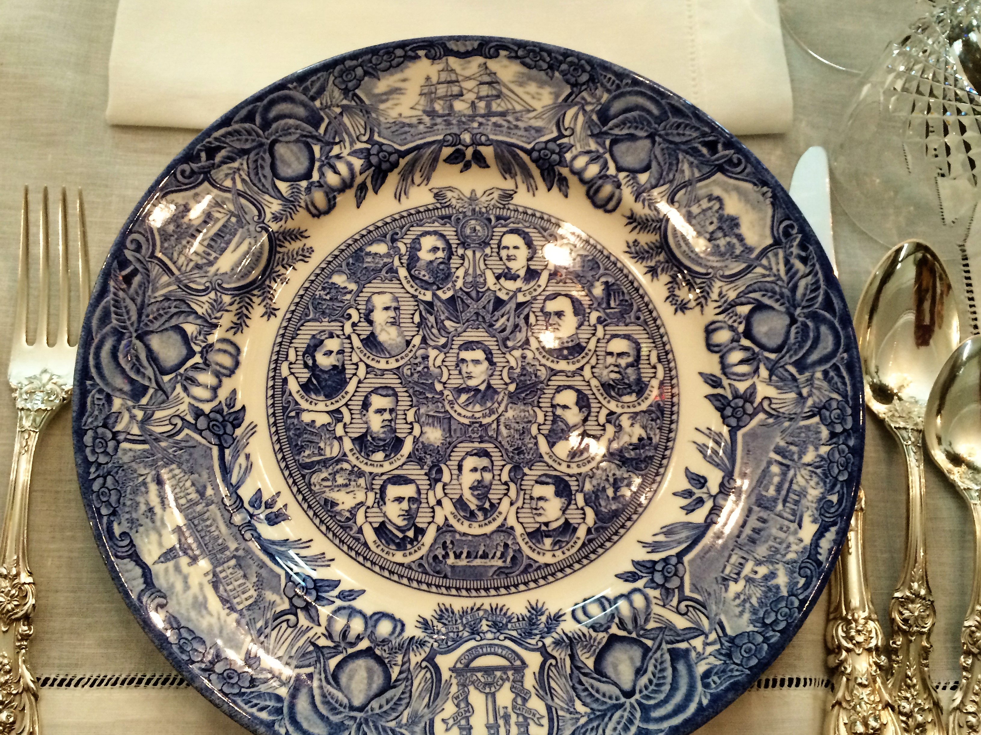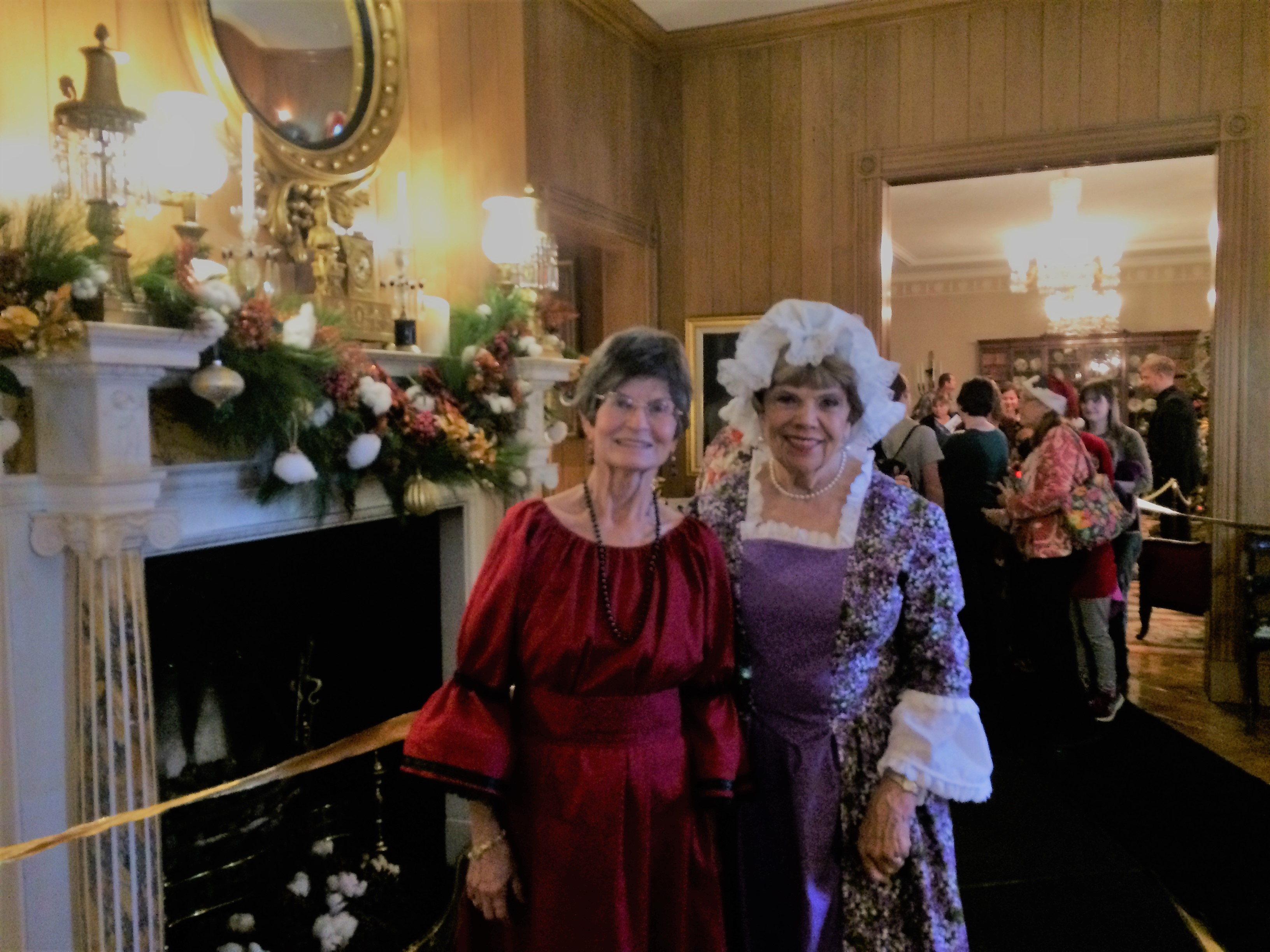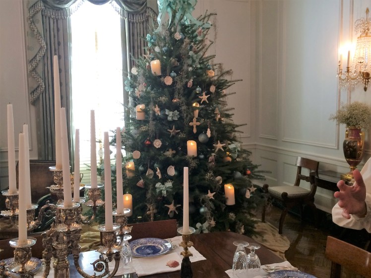 The Georgia Governor’s Mansion was built in 1967.  It is an impressive, three story Greek Revival home with 30 Doric columns surrounding the porches. Each of the columns is made from California Redwood.  Once inside, we were hosted by volunteers who gave us little tidbits about each of the rooms, furniture and decorations.  In front of one broad fireplace, we ran into two lovely volunteers wearing colonial era clothing.  In the vast dining room, we took in the Federal period furniture and state chinaware.  We soon discovered that each room was decorated according to a different region of the state.  One tree was embellished with popularly grown Georgia products, like cotton, pecans, peaches and peanuts. Another was decked in Coastal Georgia ornaments such as shells and starfish.