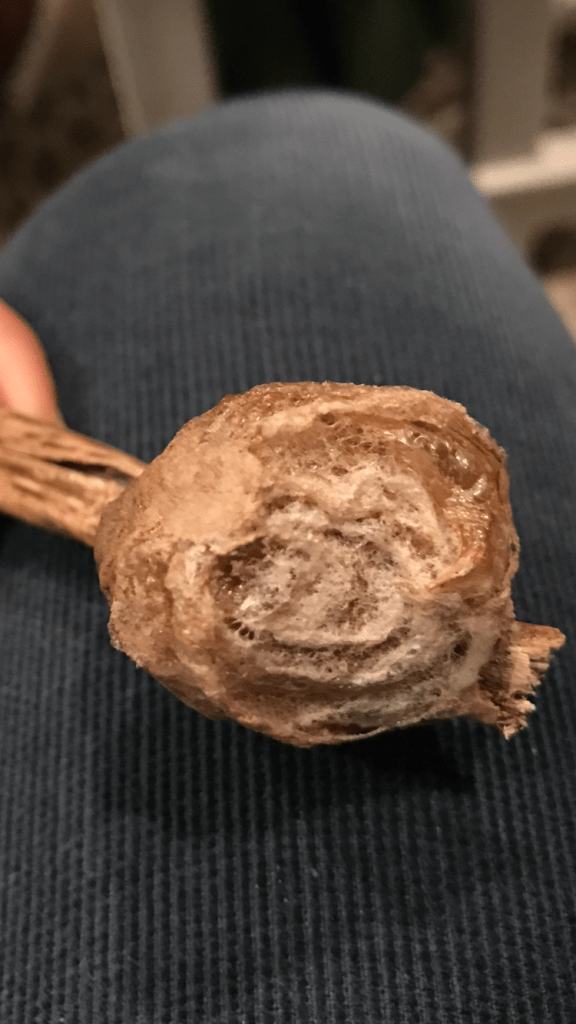 Amazingly, I survived the talk without drooling. Then I was startled awake when I heard my name called. I’d won the door prize! Guess what it was? A praying mantis nest. Hands down, the coolest door prize of all time.