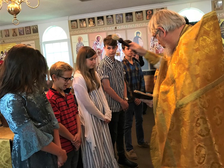 Then, of course, there’s Sunday church and the Blessing for the campers! St. Timothy’s in Toccoa, GA had 5 going to CST this year. Father Jacob douses them thoroughly with holy water after he says the prayers.