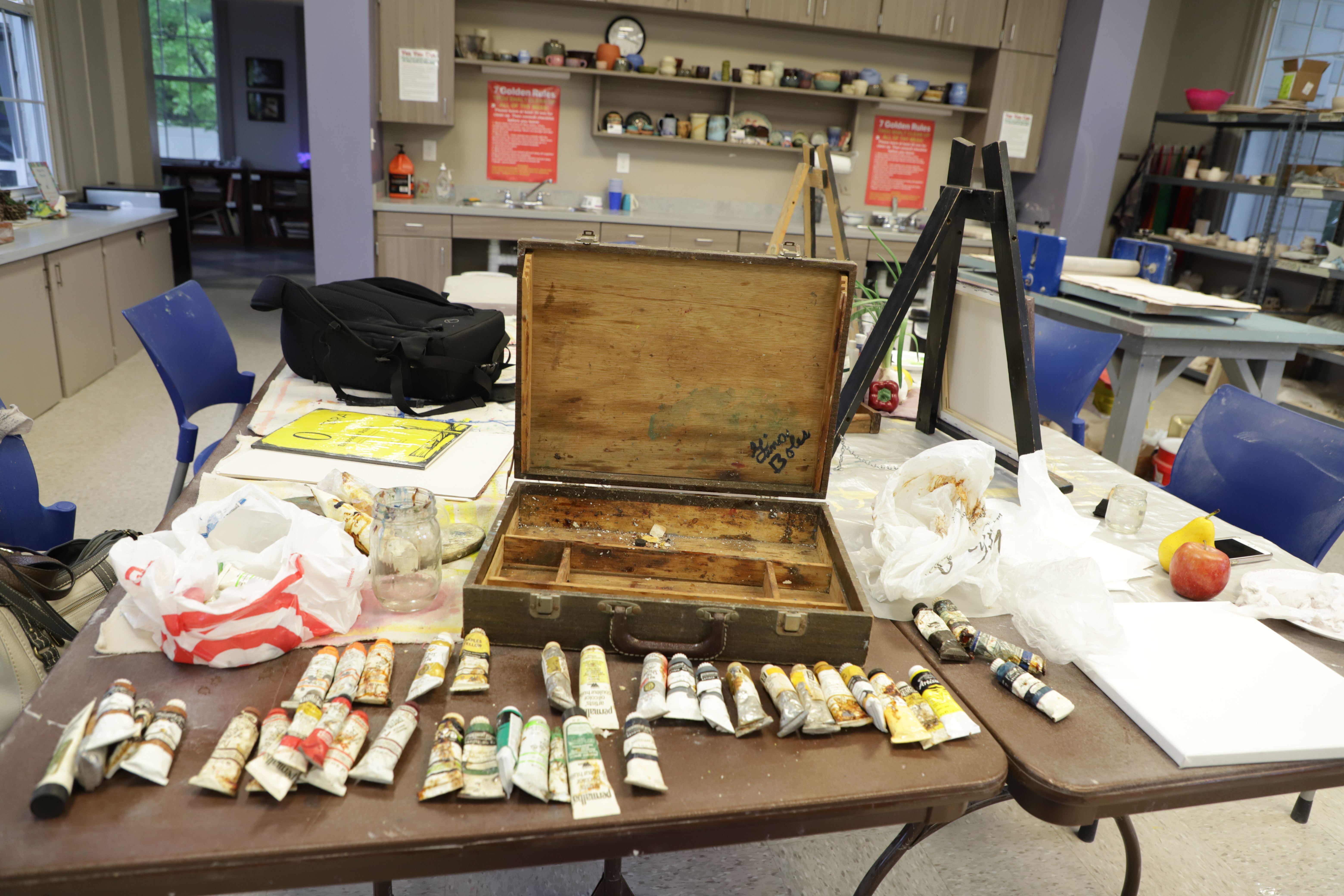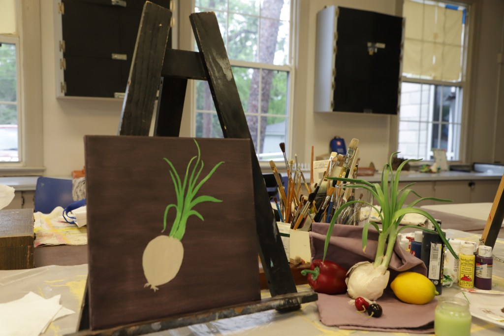 Good thing we had beginner’s confidence. These grandmothers were all quite talented. Its hard to get inspiration from a Rembrandt, when you’re still learning how to mix colors. So, I moved onto the plastic fruits and vegetables stored by the cloths and old paint jars.