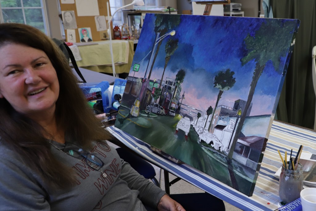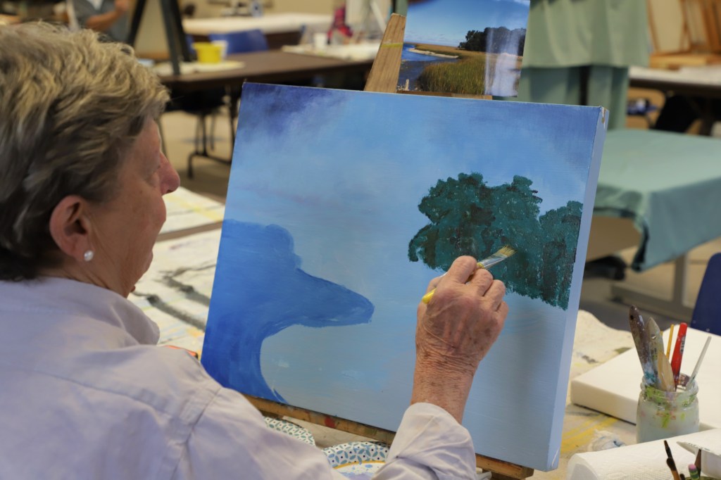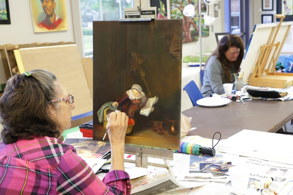 We traversed the room looking for inspiration, observing and visiting each artist. Some were painting in oil. Another was recreating a Rembrandt as a gift for her pastor. One was working on a commission. All were over 65.