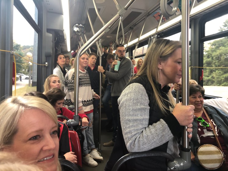 After the info session ended, we boarded a large bus and started the tour. Our red-headed guide took us to the historic North Campus, to the bell tower, past the vet school and of course, to the Sanford Stadium for photographs. We learned what it means to be a land grant university, about UGA’s major programs and about the traditions of the bell tower, the arches and the fountain. Our guide offered a quick pull on the bell rope to a couple of willing volunteers. Next we walked past the law school where his dad attended 28 years ago. Then, on to the student union and stadium.