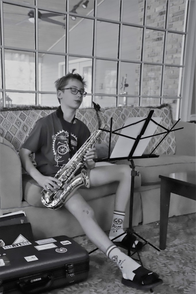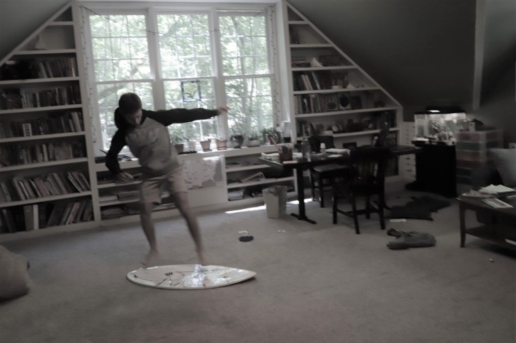 It’s hard to play a band instrument alone everyday for weeks without tuning in with your section leader or instructor. Here, an attempt is made to focus on this difficult task, for the 30th time alone. Then, move to a different room and there’s a beach bum yearning for some sand and surf to ride. I absolutely love the resourcefulness of making your own skim surface on the carpet.
