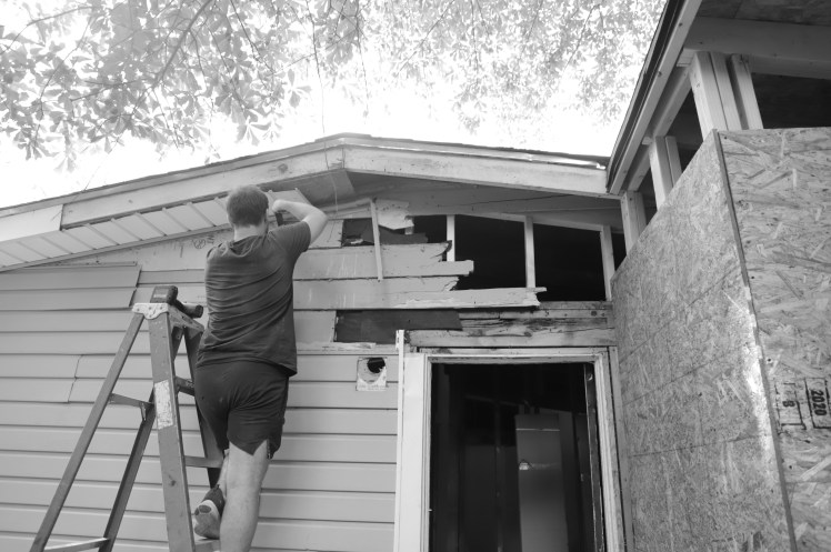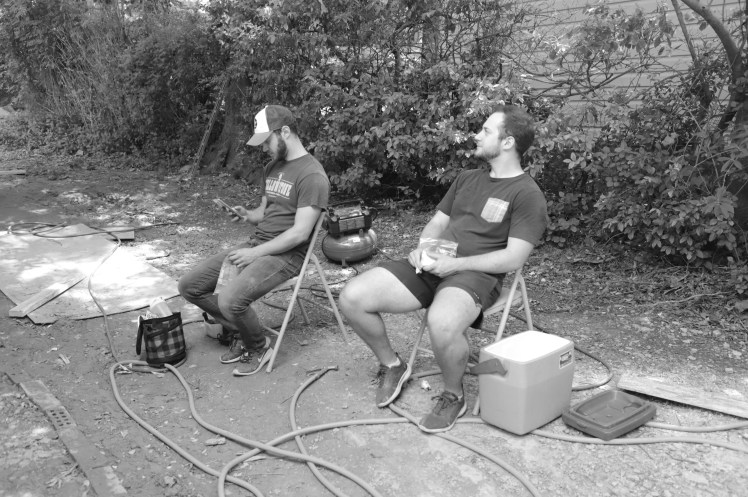 Later, I took a ride down the street to a house we are renovating. Coming in just as lunch was ending, I saw the real grunt work happening with pry bars and nail guns.