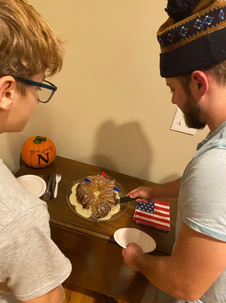 With a piece of cake in each lap, we settled in for an evening of election return excitement. This was our gala, right at home, with family and festive food.