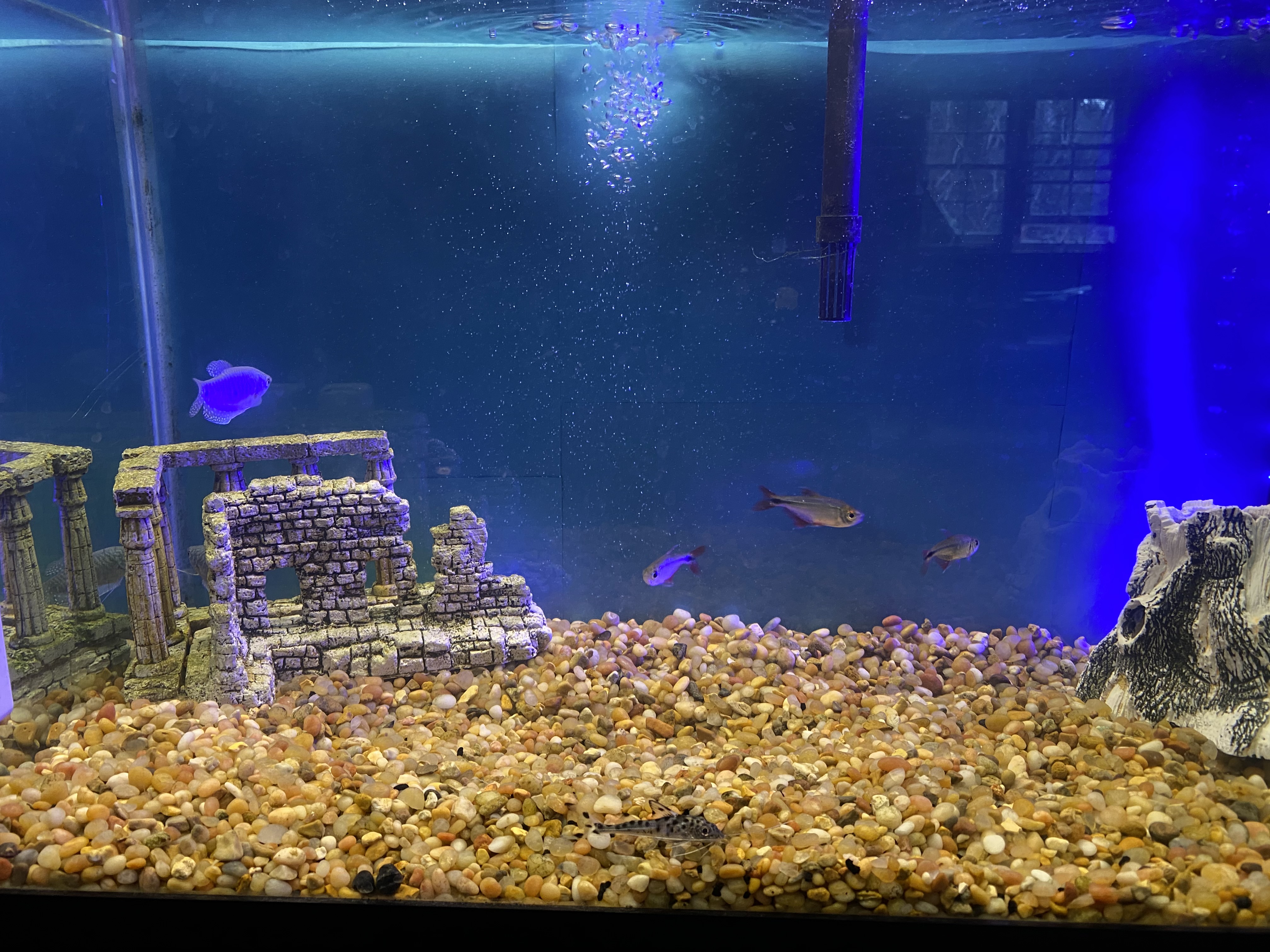 Sunday, Gabe managed to clean out the tank to give the survivors a fresh start. Yesterday, we bought two Gouramies, two tetras, two Zebra Loshes and a catfish to liven up the tank. A bubble LED light in the corner took the eeriness away. Now, we’re back in business.