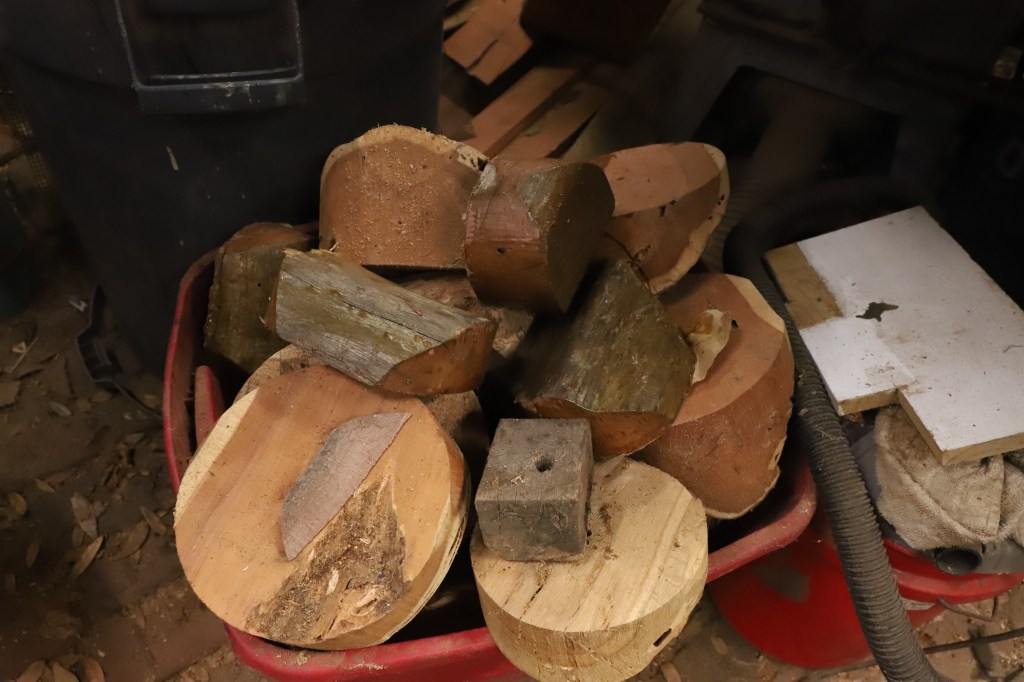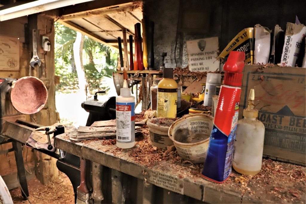The flip-flop walk always produces a decent amount of sand between the toes. So, the first thing I do when I arrive is take a minute to clean off the feet. Then, we head for the shed. As we approached, an earthy reassuring scent of bark and oil drew us inside. There, we glimpsed a good look at the wood working operation.