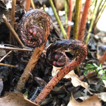 Slice of Life 2019: Day 19 Fiddle Heads! Hidden beneath brown leaves they push up as little sheathes. Soft, orange, and hairy — At first they look scary. Like a fresh born baby before its bath, or a drunk at his draught. A closer look at the tender shoot, as it erupts from its mother’s … More Fiddle Heads!